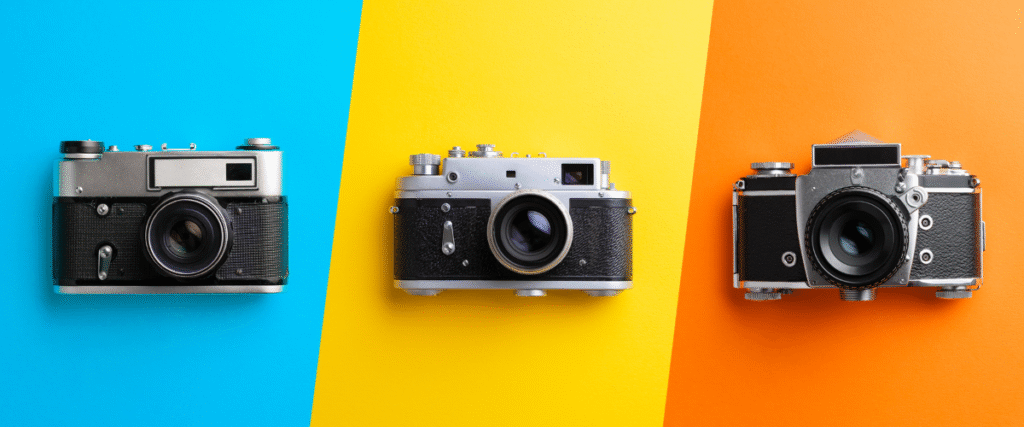 A black and white photo of a well-equipped photography studio with lighting equipment and tripods.